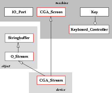 Testausgaben können die Fehlersuche vereinfachen und bieten eine gute Gelegenheit, sich in eine vorgegebene Entwicklungsumgebung einzuarbeiten. Aus diesem Grund soll unser Übungsbetriebssystem oo-StuBS als erstes solche Ausgabefunktionen erhalten. Die zu implementierenden Ausgabefunktionen sollen ähnlich wie die IO-Streams der C++ Bibliothek verwendet werden können und mit Hilfe der Klassen IO_Port (wird von uns vorgegeben), CGA_Screen, Stringbuffer, O_Stream und CGA_Stream umgesetzt werden. Damit die Ausgabefunktionen auch überall in oo-StuBS verwendet werden können, soll ein globales CGA_Stream Objekt kout erzeugt werden. Um darüber hinaus auch interaktive Anwendungsprogramme zu erlauben, sollt ihr zusätzlich noch die Klasse Keyboard_Controller vervollständigen, die neben Key in der Vorgabe enthalten ist.